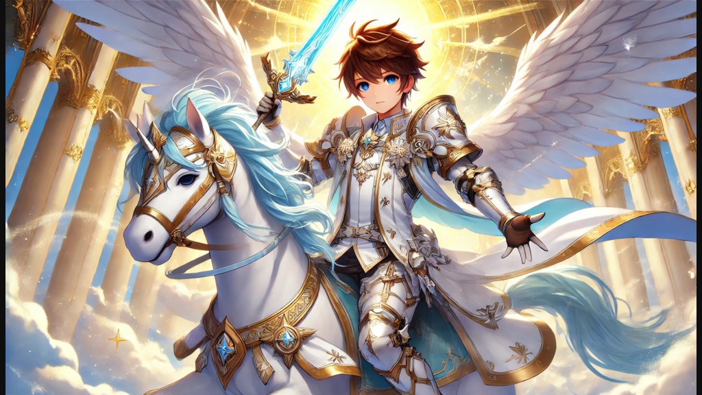 His loyal steed is Cielo, a majestic white-winged heavenly pony, steadfast and unyielding in battle.