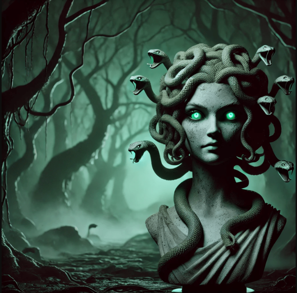 After Medusa’s death, her severed head retained its petrifying power and was later gifted to Athena, who placed it on her shield, the Aegis. From her blood sprang the winged horse Pegasus and the warrior Chrysaor, her children with Poseidon. Some myths portray Medusa more sympathetically, as a tragic figure punished unfairly. Others suggest her head symbolized protection, appearing on ancient armor and buildings to ward off evil. Over time, her legend evolved from a terrifying monster into a symbol of feminine rage, transformation, and resilience in modern interpretations.