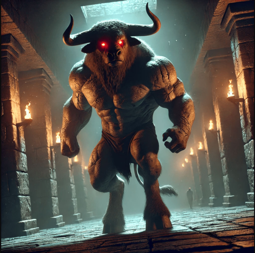 The Minotaur, a half-man, half-bull creature, was the result of a curse placed upon Queen Pasiphaë of Crete by Poseidon. King Minos had refused to sacrifice a divine bull to the god, so as punishment, Pasiphaë fell in love with the beast and bore the Minotaur. Born monstrous and uncontrollable, the Minotaur became a source of shame and fear for Minos. To contain it, the legendary architect Daedalus was commissioned to construct the Labyrinth, a massive, inescapable maze beneath the palace of Knossos. There, the Minotaur was imprisoned, growing more savage as time passed.