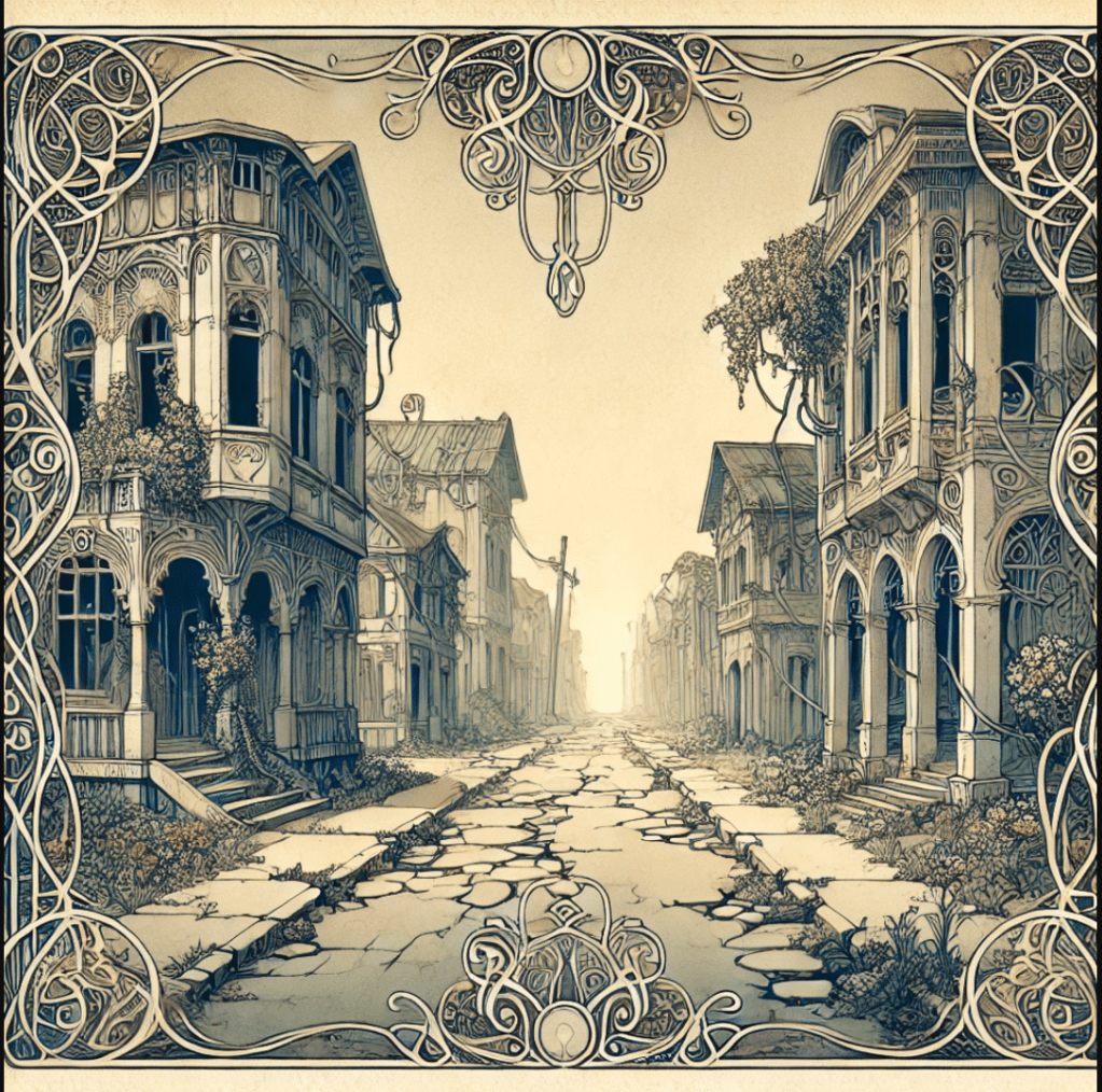 As they walked through the abandoned village, torn scraps of paper blew past them, carried upward by the wind into the empty sky.