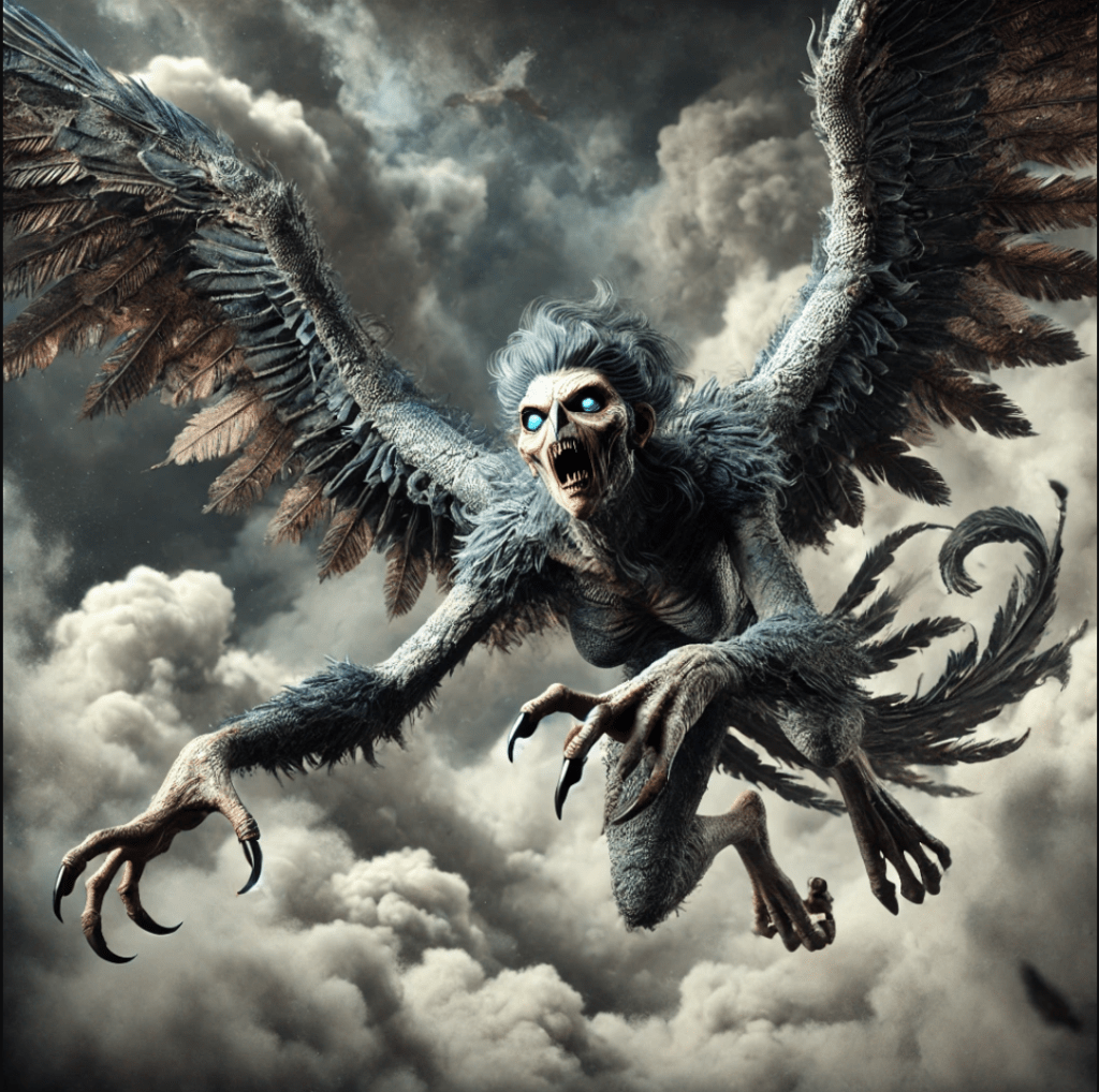 The Harpies were fierce, winged spirits in Greek mythology, often depicted as half-woman, half-bird creatures with sharp talons. Their name means “snatchers,” as they were known for stealing food and carrying off souls to the underworld. Originally, they were wind spirits, but later myths portrayed them as agents of divine punishment. They would descend upon their victims with terrifying speed, leaving destruction and despair in their wake. Their most famous role was in the story of King Phineus of Thrace.