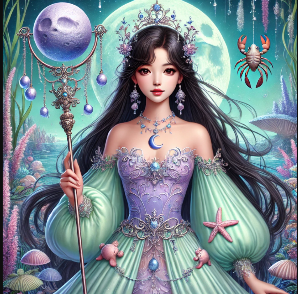Princess Ruana has two forms: the mermaid and the sea maiden. As a mermaid, she glides swiftly through the sea with her shimmering sea green tail. As the sea maiden, she stands gracefully in her seafoam green and lavender dress, holding her lunar scepter.