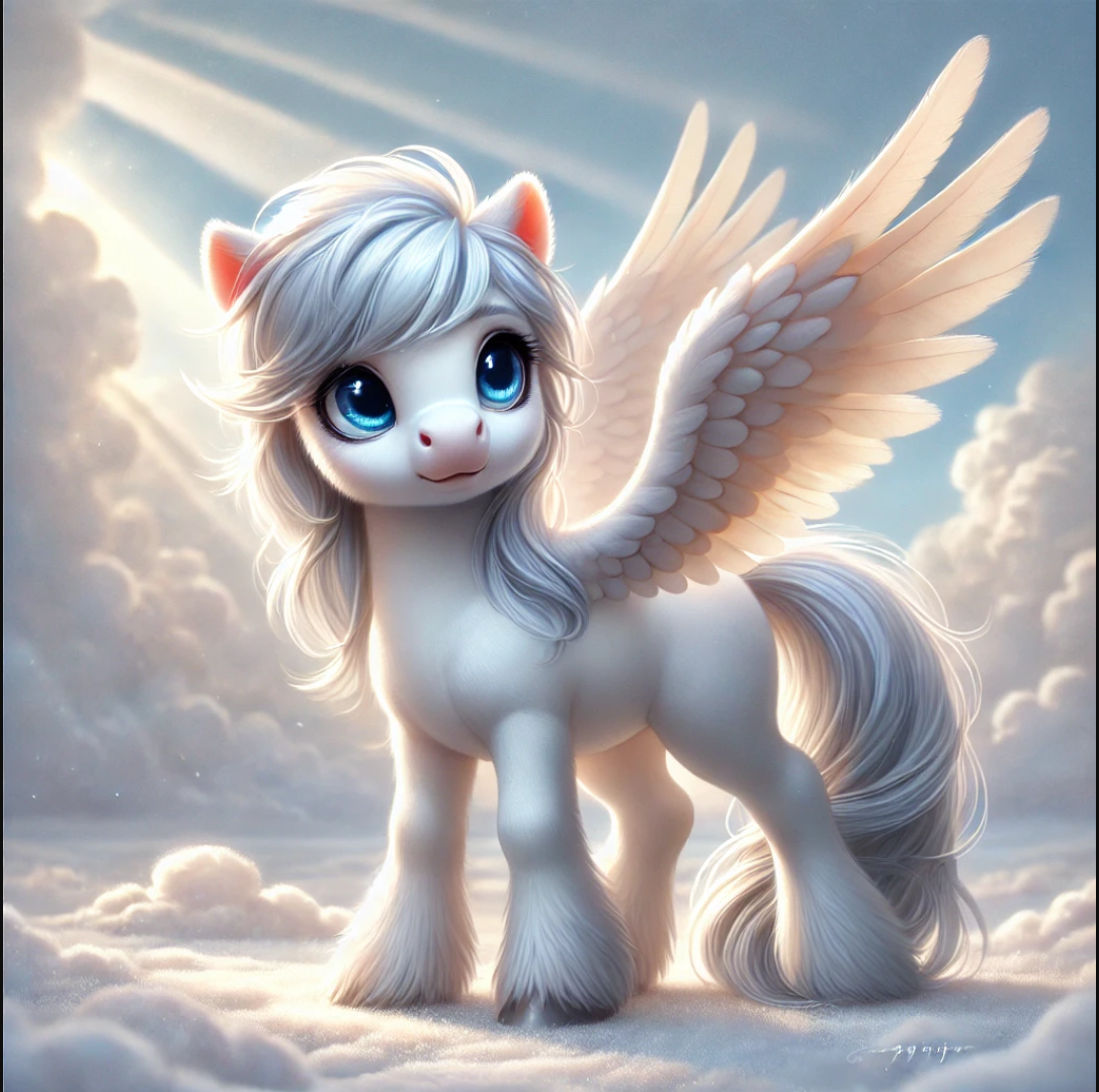 Cerulean’s loyal steed is Cielo, a majestic white-winged heavenly pony, steadfast and unyielding in battle.