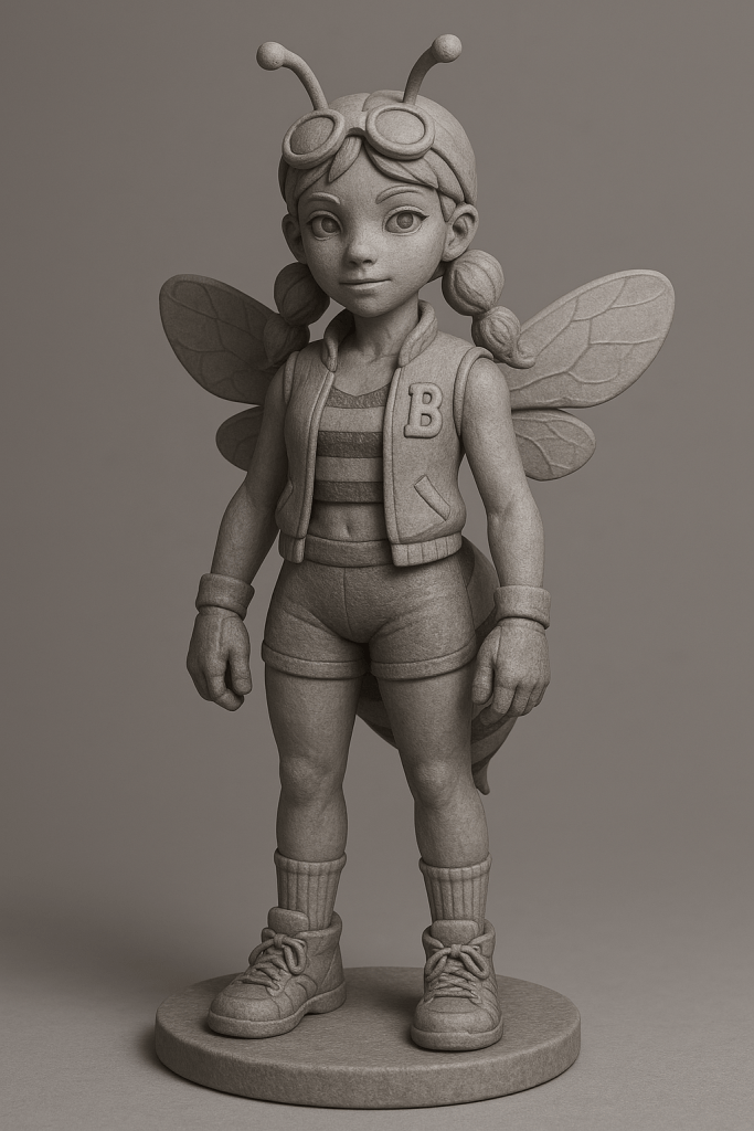 The cocoon twists, folding neatly into a compact sphere. From its center, Bee Girl emerges—transformed. The cocoon splits and reshapes into her signature honeybee wings: two large upper wings and two smaller lower ones. They beat so quickly they blur from sight, creating a steady, vibrant buzz as Bee Girl hovers effortlessly above the ground.