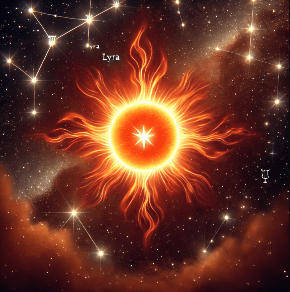 The Orange Luminary orbits the Star of Vis—a blue-white fallen star—in the fourth plane of the Visean Cosmos. It is a radiant, sentient body that shines with a warm, orange glow. When the Star of Vis board game is completed, the Cosmic Cataclysm—a swirling stellar twister—unleashes this celestial giant into the physical realm.