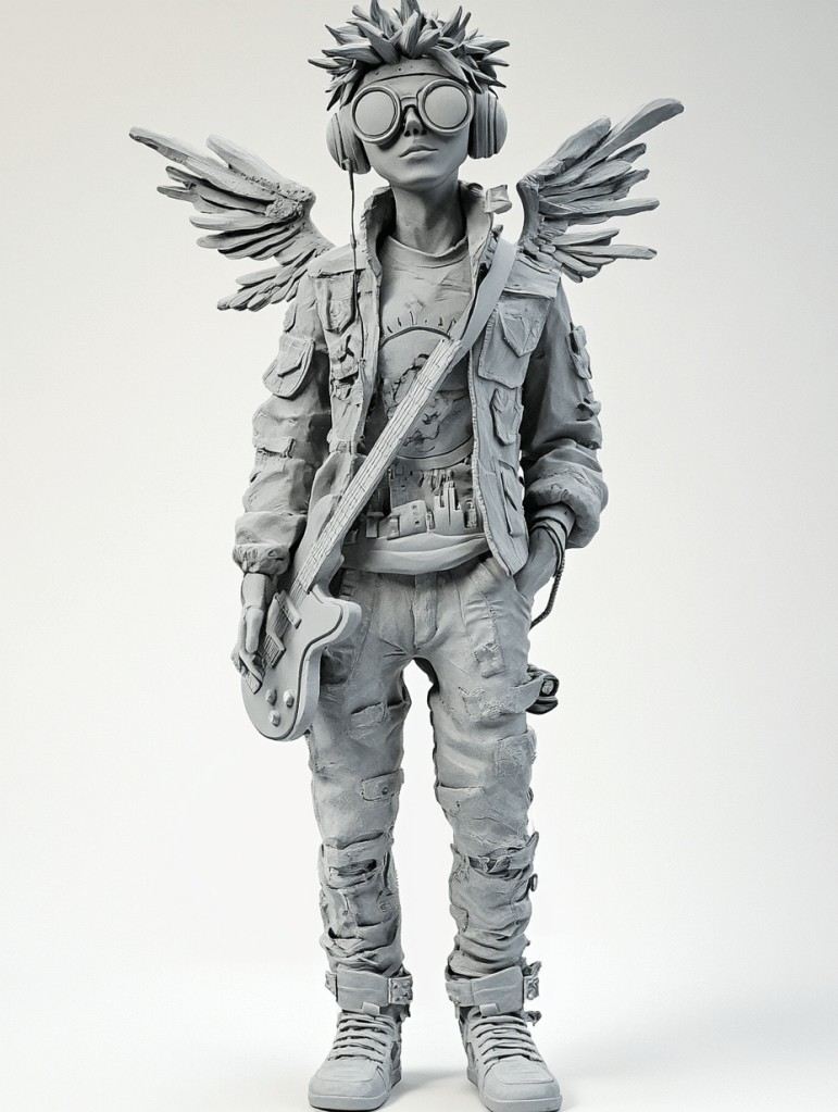 Standing in place of the boy is Oppa Rockstar—an eccentric K-pop idol with white spiky hair, magenta visor glasses, and a gleaming butterscotch guitar strapped confidently across his back. His white-and-gray jacket, traced with glowing cyan outlines of a futuristic city, flows stylishly over an orange shirt marked with the blazing outline of the sun. Matching pants and rich yellow sneakers complete his vibrant look, while apple green fingerless gloves pulse faintly with rhythm.