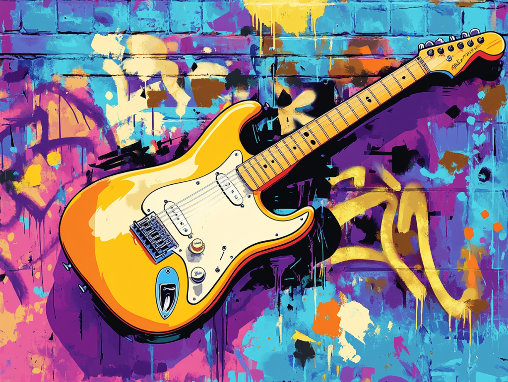 Strapped across his body is a butterscotch-colored electric guitar, his instrument of choice and a key to his musical magic. His look is accented by apple green fingerless gloves and rich yellow sneakers with shoe laces, amplifying his quirky, genre-blending style.