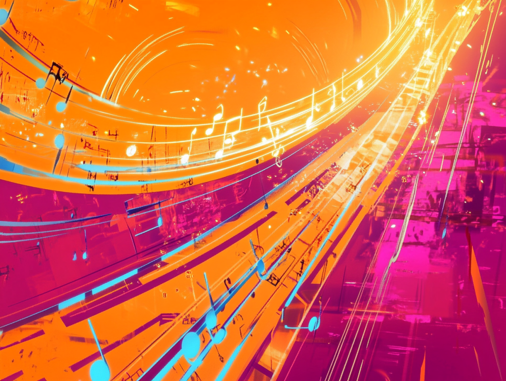 James lifts his guitar and begins to strum. The sound is electric—bold, vibrant, alive. An orange musical staff swirls around him like a ribbon of light, spiraling upward as his feet leave the ground. He twirls with it, swept into the beat. Cyan, magenta, and yellow notes burst into the air, pulsing with every chord—each one popping like fireworks in tune with his rhythm.