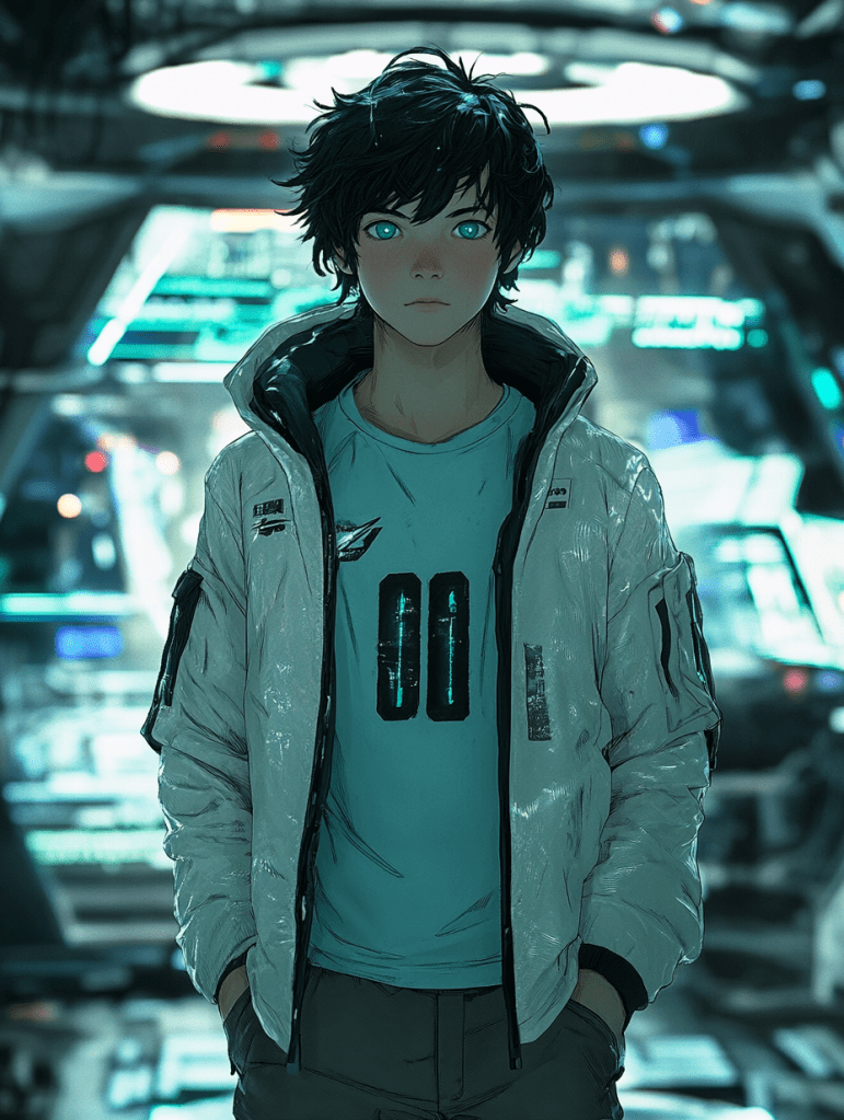 Alucard Geyserford is a fifteen-year-old with unkempt, jet-black hair and striking turquoise eyes. Tall and lean, his fine features and fair complexion give him a slightly ethereal look—but it’s the distant gaze that stands out most, always wandering, always deep in thought. He usually wears a comfy jacket over a casual shirt, paired with well-worn sweatpants. Aloof and emotionally reserved, Alucard radiates a cool, laid-back energy that masks a storm of thought beneath the surface.