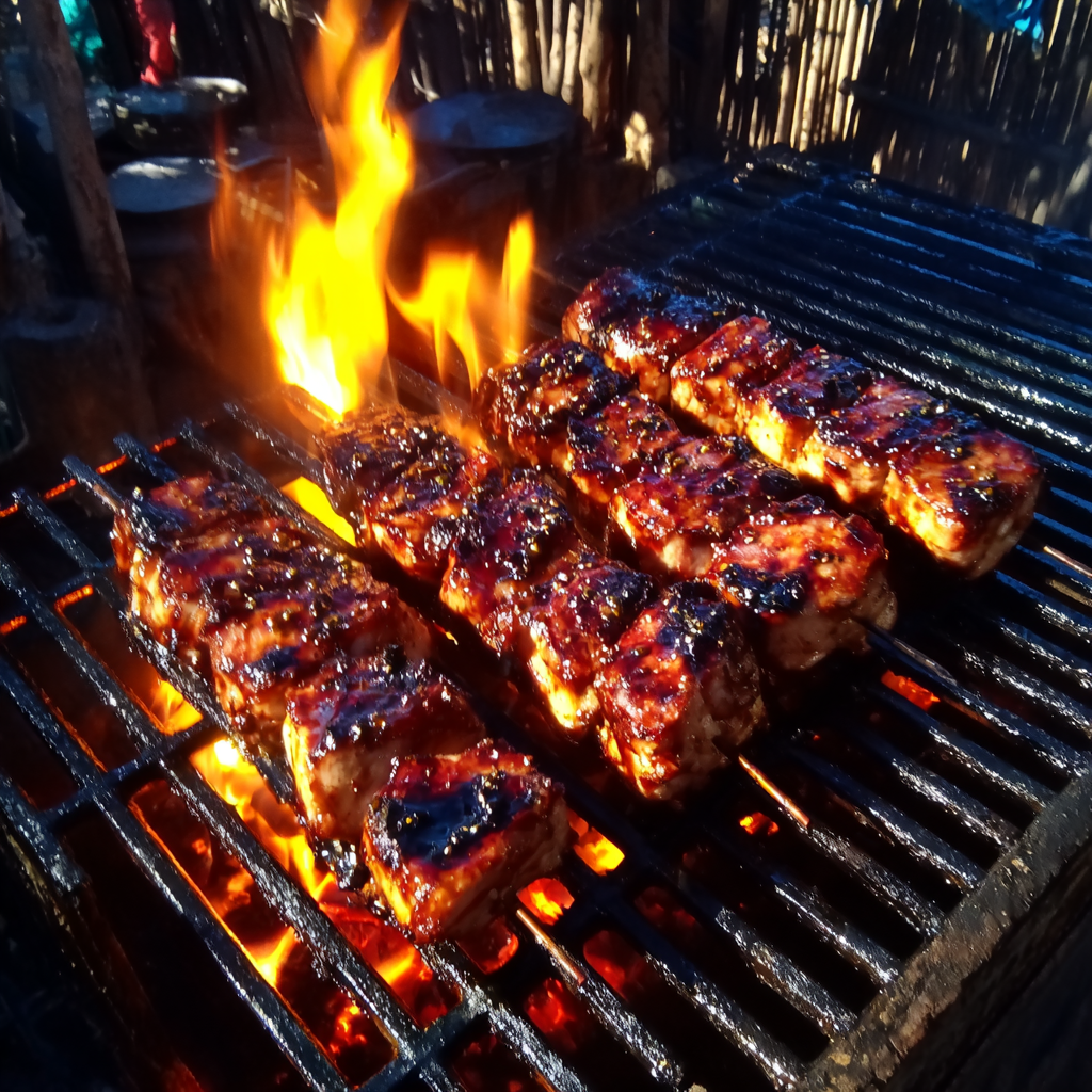 After exactly four minutes—his internal chronometer apparently calibrated through extensive grilling experience—he observes that one side of the pork has achieved the perfect balance of caramelization and doneness that represents successful Filipino BBQ technique execution. Before flipping the skewers, he reaches for his basting brush like someone accessing a critical crafting tool.