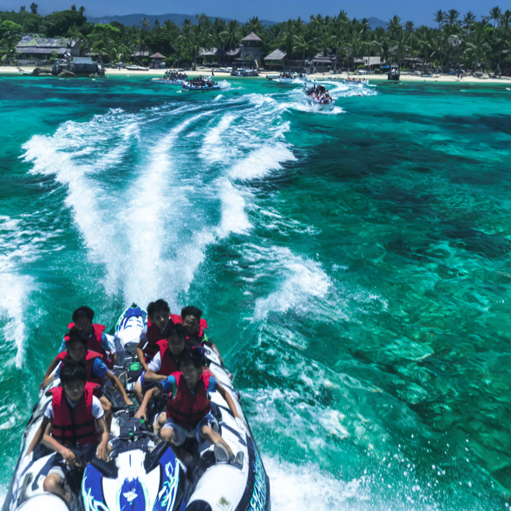 Michael immediately transitions from disappointed jet ski wannabe to excited banana boat participant, racing through the water toward the activity staging area with renewed energy that suggests his entertainment requirements have been successfully met through alternative means.