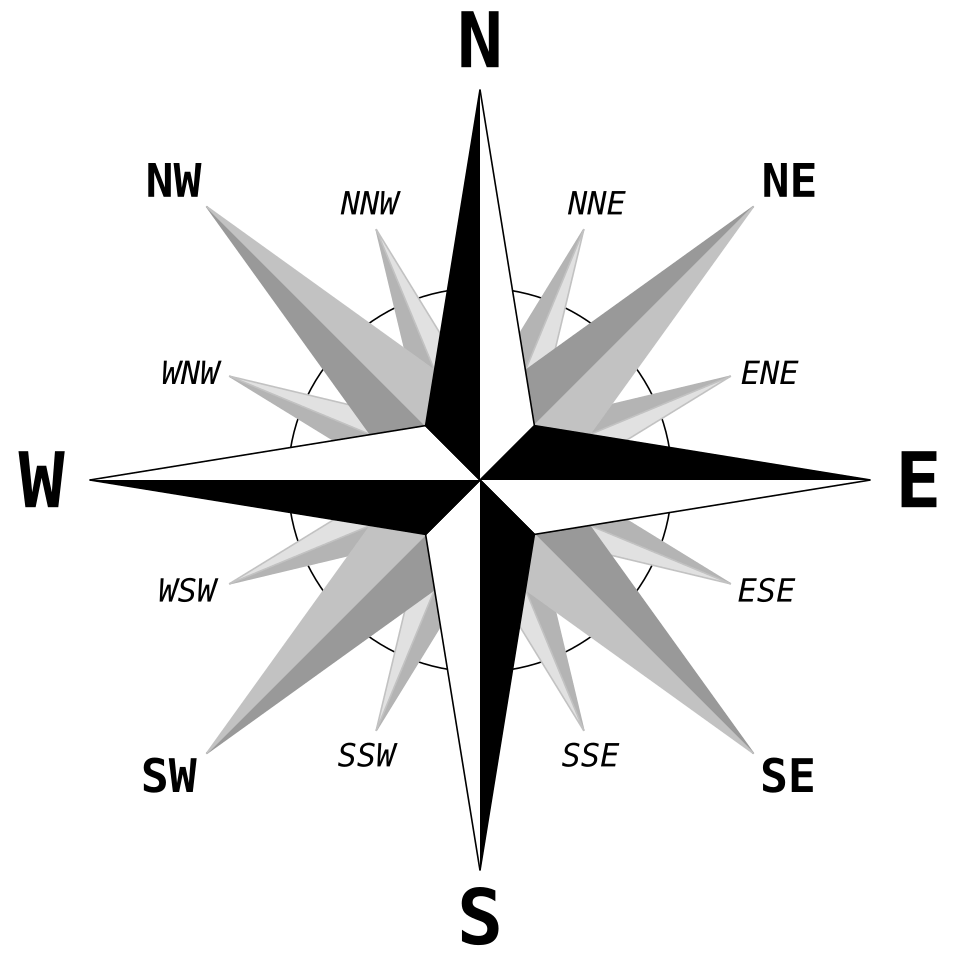 Below the title, an image materializes—a compass rose rendered in that same blue-white glow. Eight directions marked clearly: North, Northeast, East, Southeast, South, Southwest, West, Northwest. Each point pulses with subtle light, like they’re selectable options in a menu screen.