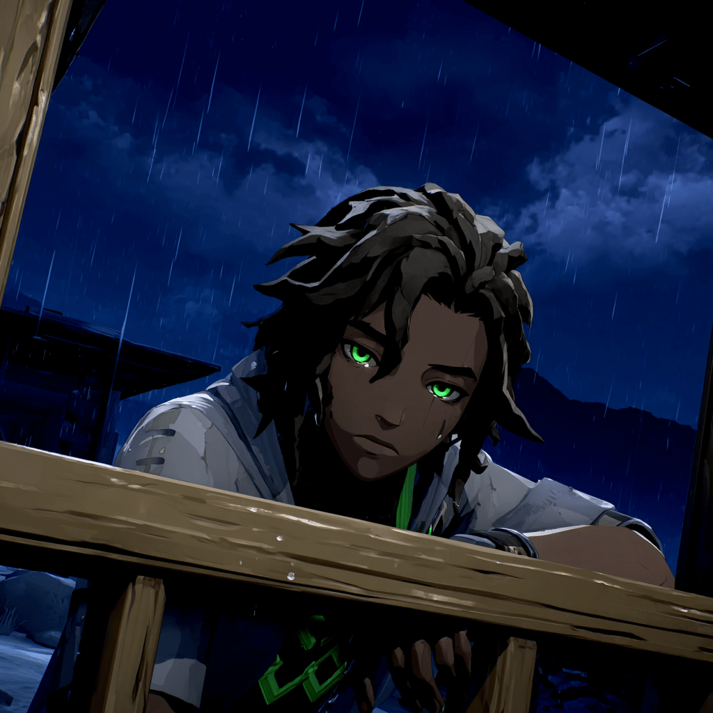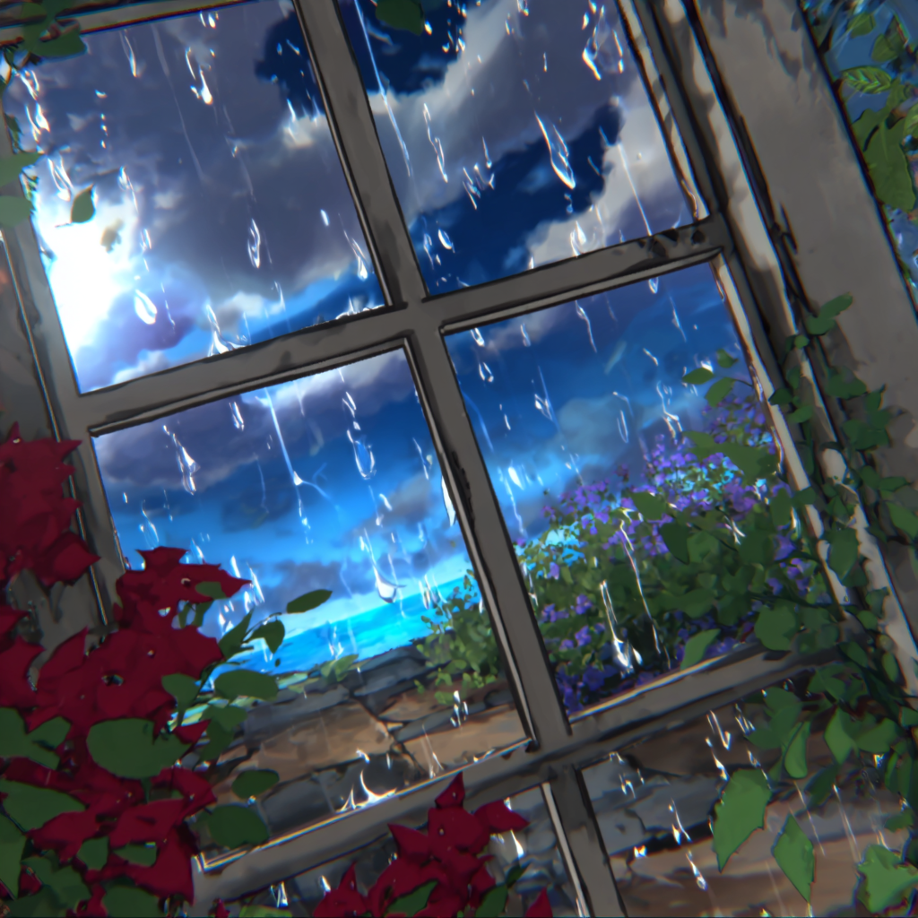 Rain hammers the window like a boss fight on hard mode—relentless, merciless, zero checkpoints. The glass streams with water, each droplet racing downward in that hypnotic way that makes me think of loading screens that never end.