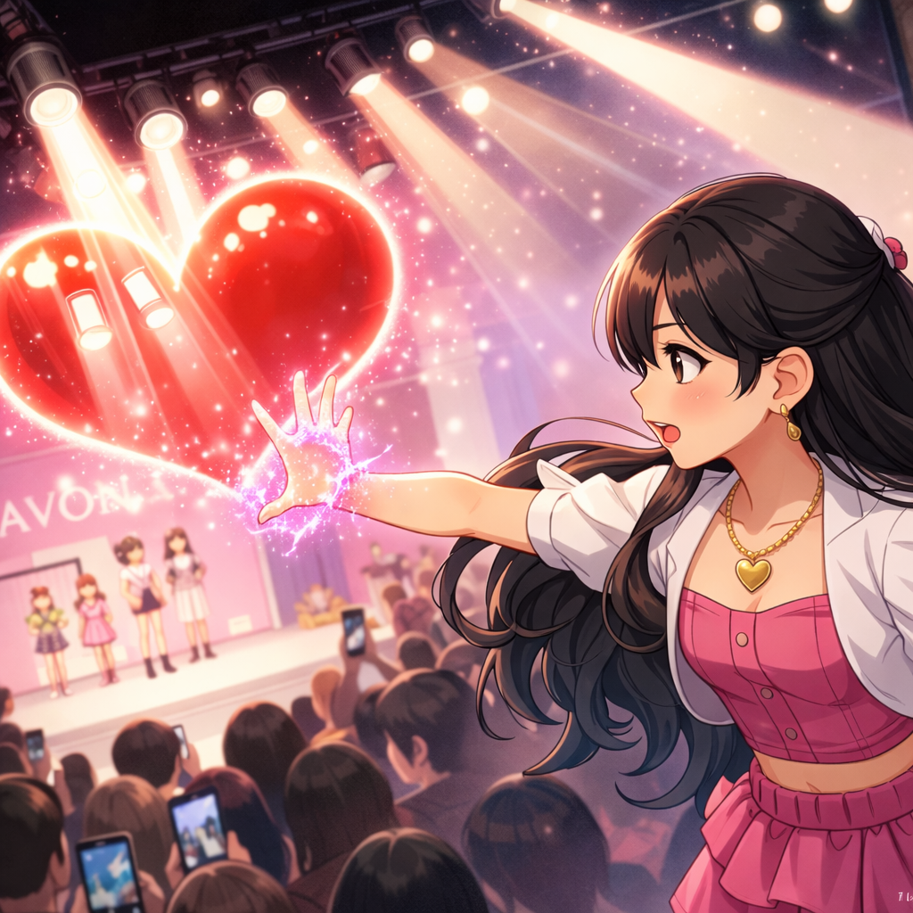 Not metaphorically. Not symbolically. An actual luminous pink heart manifests from her palm and launches into the space above the audience like a magical projectile programmed with rescue protocols.