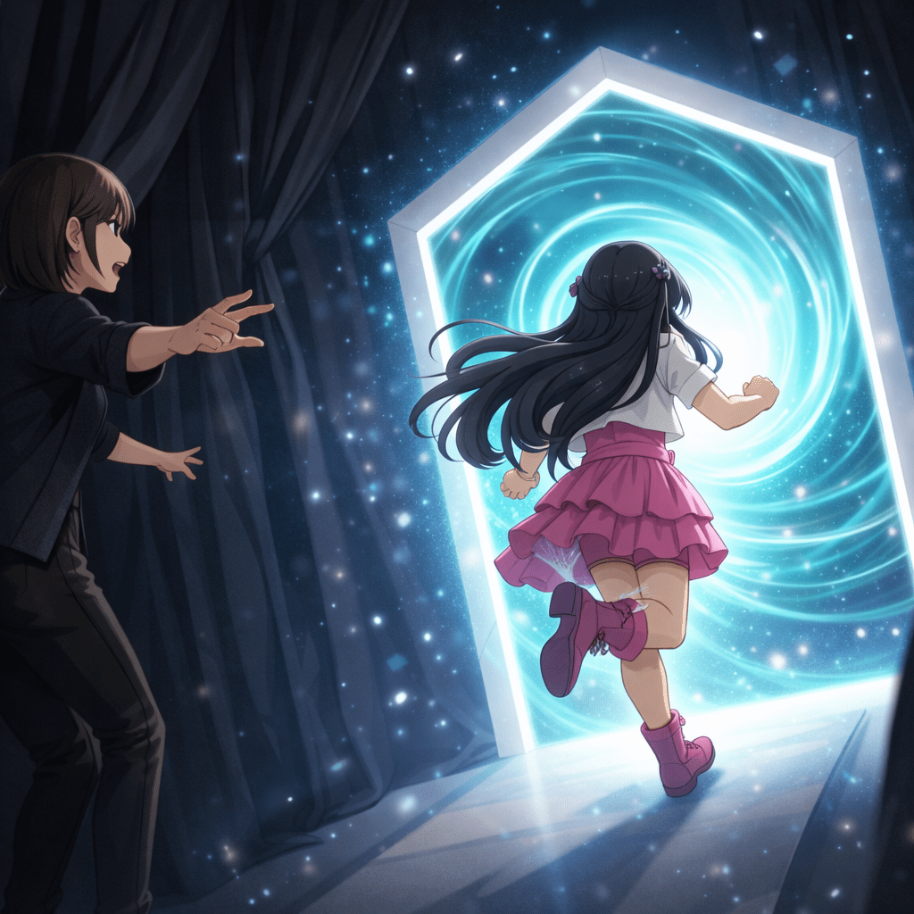 From her position behind the curtain, Allison’s instinct overrides conscious thought. Her palm extends toward the falling lights like she’s practiced this move a thousand times in her imagination while watching Pretty Cure transformation sequences.
