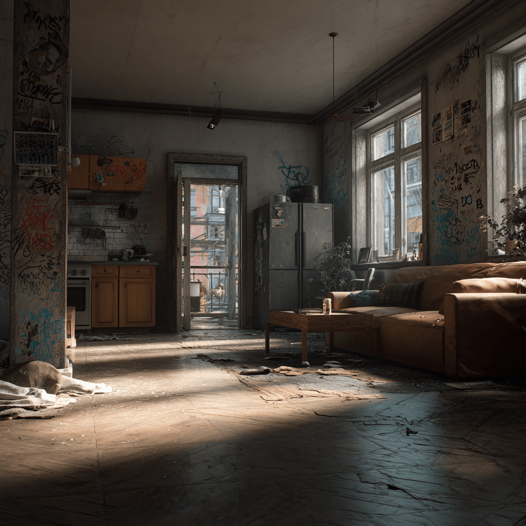 Three men, arms full of other people’s things, are backing out of a ground-floor unit that clearly doesn’t belong to them. Electronics. Clothing. A small appliance still in its box. Their leader is broad, unhurried, wearing the expression of someone who has decided that chaos is an opportunity and is very pleased with his own cleverness. Behind him, his two associates are already arguing over who carries what.