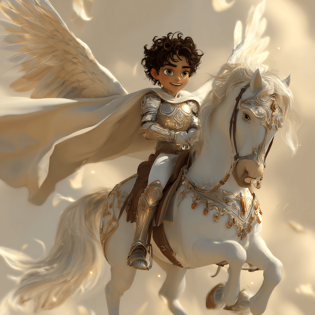 He climbs onto the Pegasus’s back, settles between the wings, and the horse launches.