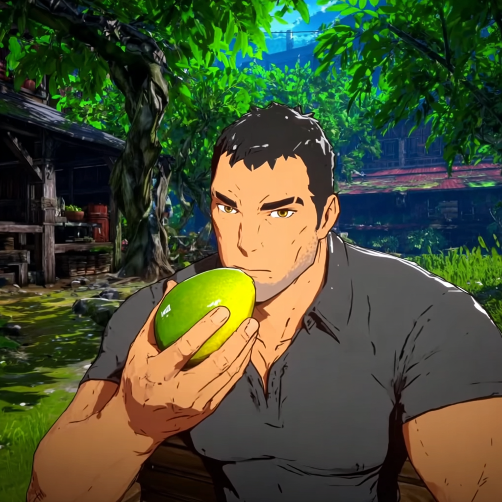 The fruit’s golden flesh glistens as he strips away the skin with practiced efficiency. Juice immediately starts dripping down his fingers, but the man’s completely unbothered—he’s operating in full primal mode, where taste trumps every other consideration. His first bite produces this expression of pure satisfaction that suggests he’s just discovered the best consumable item in the game.